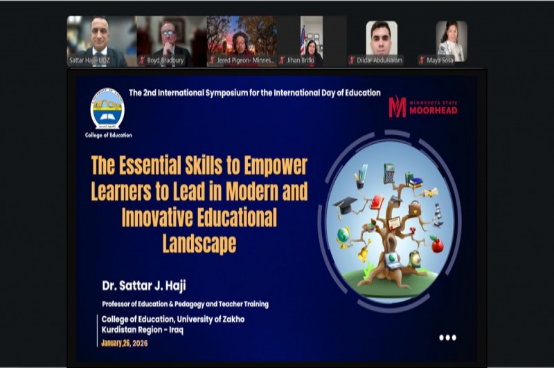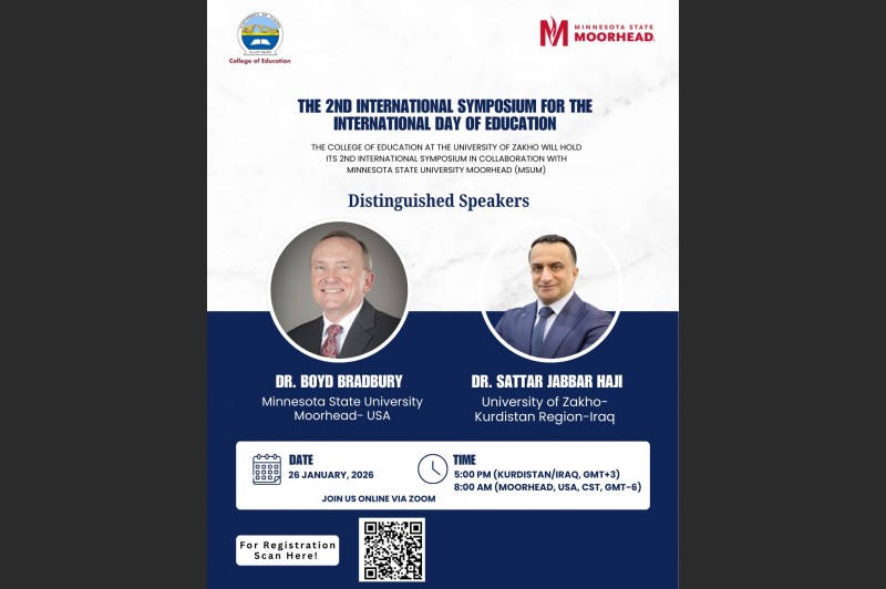 On 26 January 2026, the Second International Symposium organized by the College of Education at the University of Zakho, in collaboration with Minnesota State University, Moorhead (MSUM), concluded as part of activities marking International Education Day. The symposium brought together academics and representatives from local, regional, and international educational and pedagogical institutions. Thus, the event fostered scholarly dialogue and the exchange of expertise in the field of education.